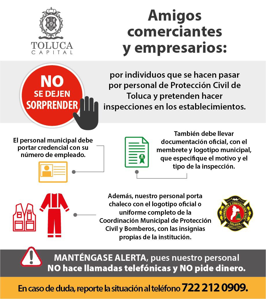 La Coordinación Municipal de Protección Civil y Bomberos de Toluca alerta a la población sobre personas que usurpan funciones de servidores públicos, principalmente a medianos y pequeños comercios. Aclara que la corporación no realiza llamadas telefónicas ni solicita dádivas de ningún tipo.