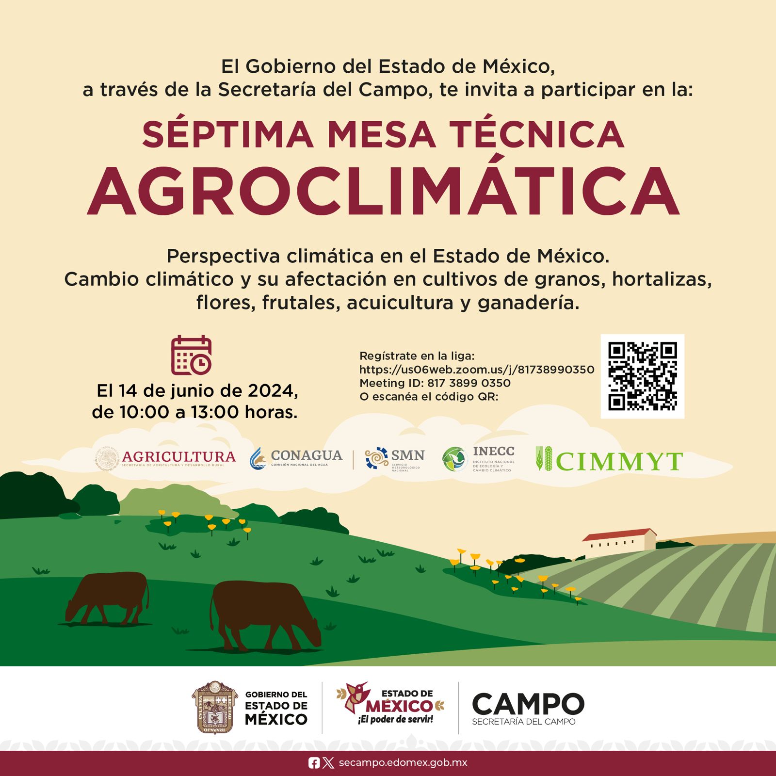 Con el fin de informar a los productores agropecuarios sobre los pronósticos del clima para los próximos meses, así como conocer sus necesidades y encontrar soluciones, el Gobierno del Estado de México que encabeza la Maestra Delfina Gómez Álvarez, convoca a la Séptima Mesa Técnica Agroclimática que se realizará el viernes 14 de junio.