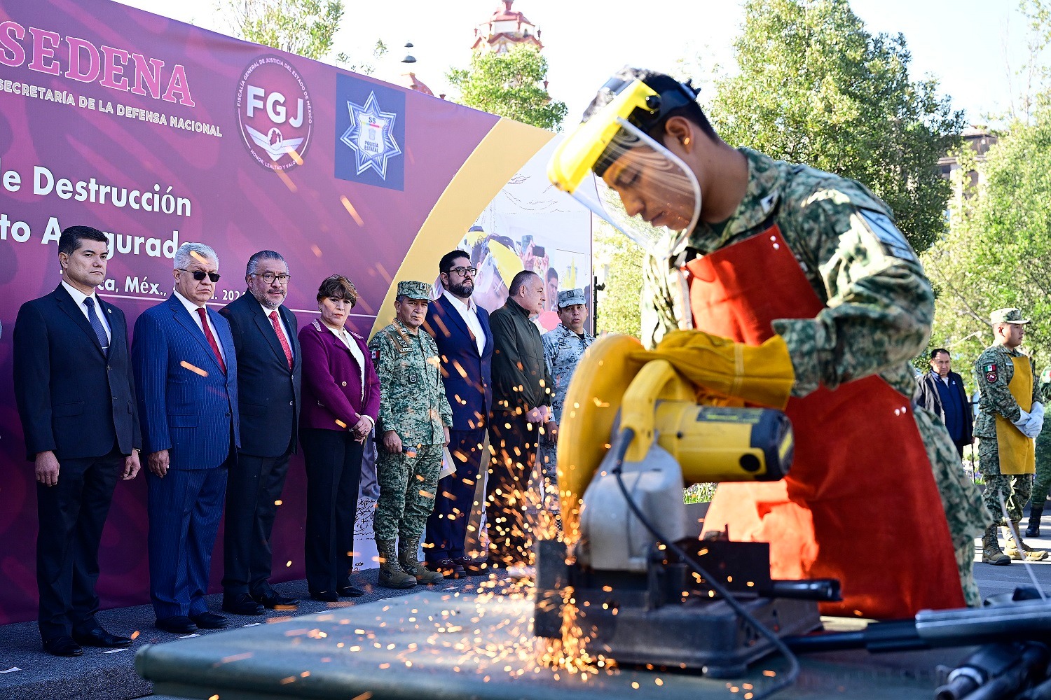 Al término de la ceremonia cívica en la Plaza de los Mártires, la Gobernadora Delfina Gómez Álvarez fue testigo de la destrucción de 54 armas cortas y 28 largas, las cuales fueron aseguradas por los tres órdenes de gobierno.