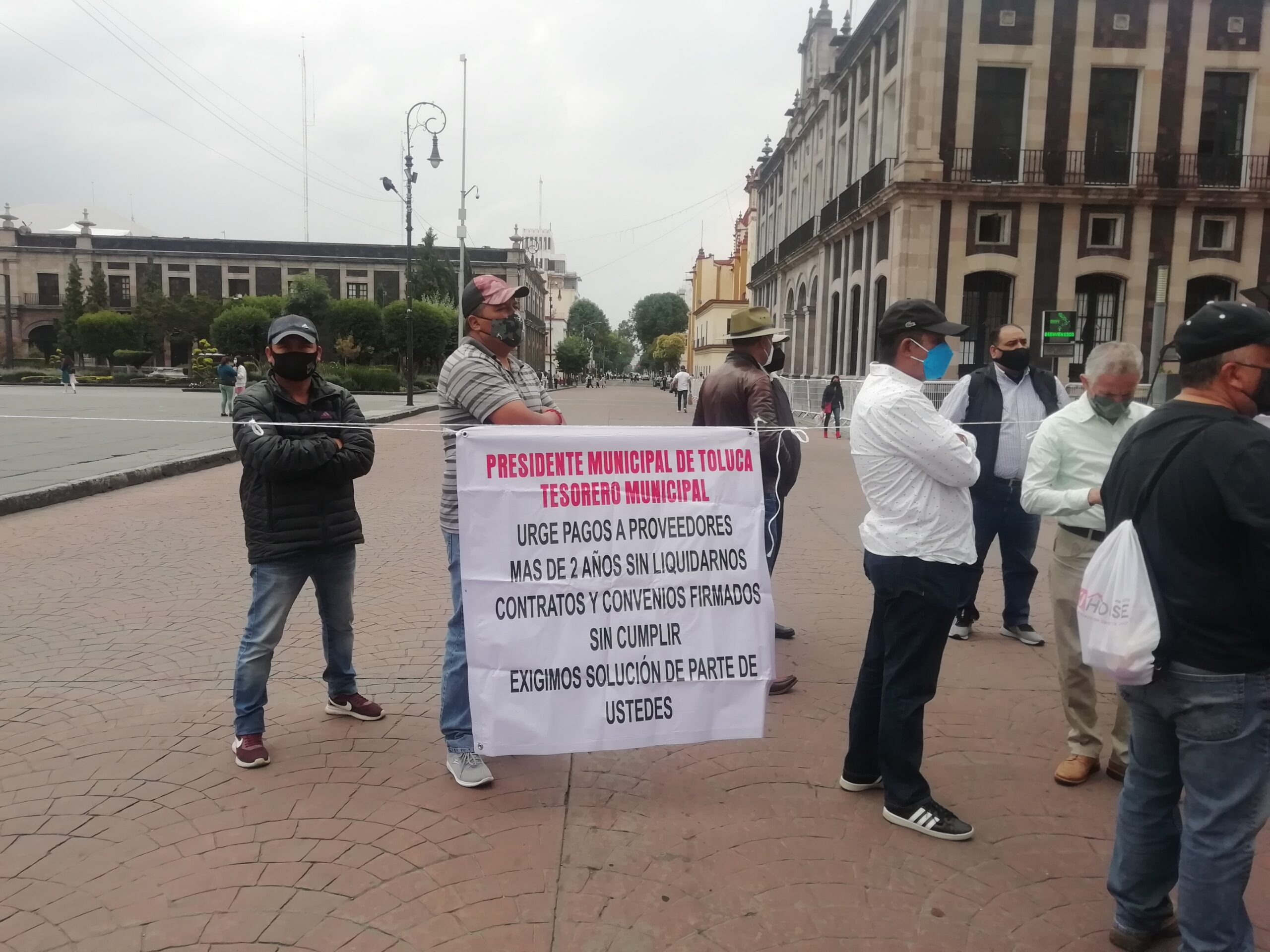 De nueva cuenta arrendadores y proveedores del Ayuntamiento de Toluca se manifestaron frente a palacio municipal y bloquearon la calle Independencia para exigir el pago de sus facturas, pues aseguran, son más de 17 meses los que no han recibido monto alguno.