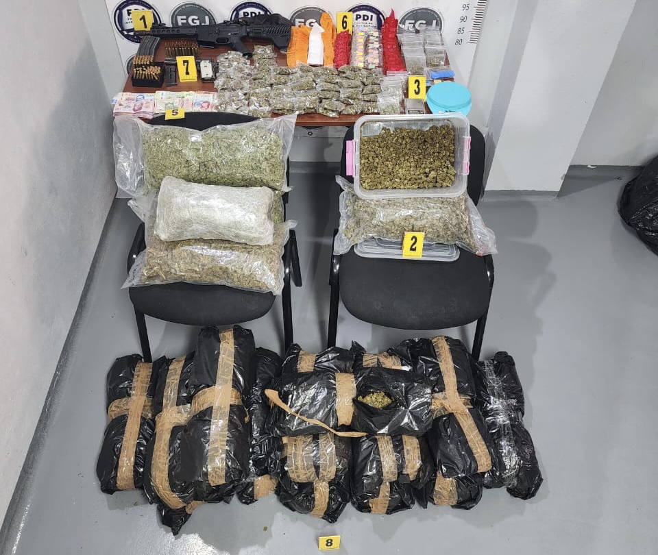 Una vez que este mandamiento judicial fue otorgado, personal de la FGJEM, Guardia Nacional y Secretaría de Seguridad del Estado de México, se trasladaron al inmueble, donde fueron asegurados paquetes, bolsas y recipientes con un total de 40 kilogramos de marihuana, más de 300 envoltorios con droga conocida como cristal, un arma de fuego larga abastecida con cargador con cartuchos útiles y un arma de fuego corta también abastecida con cartuchos útiles, 66 cartuchos útiles de diversos calibres, básculas y dinero en efectivo.