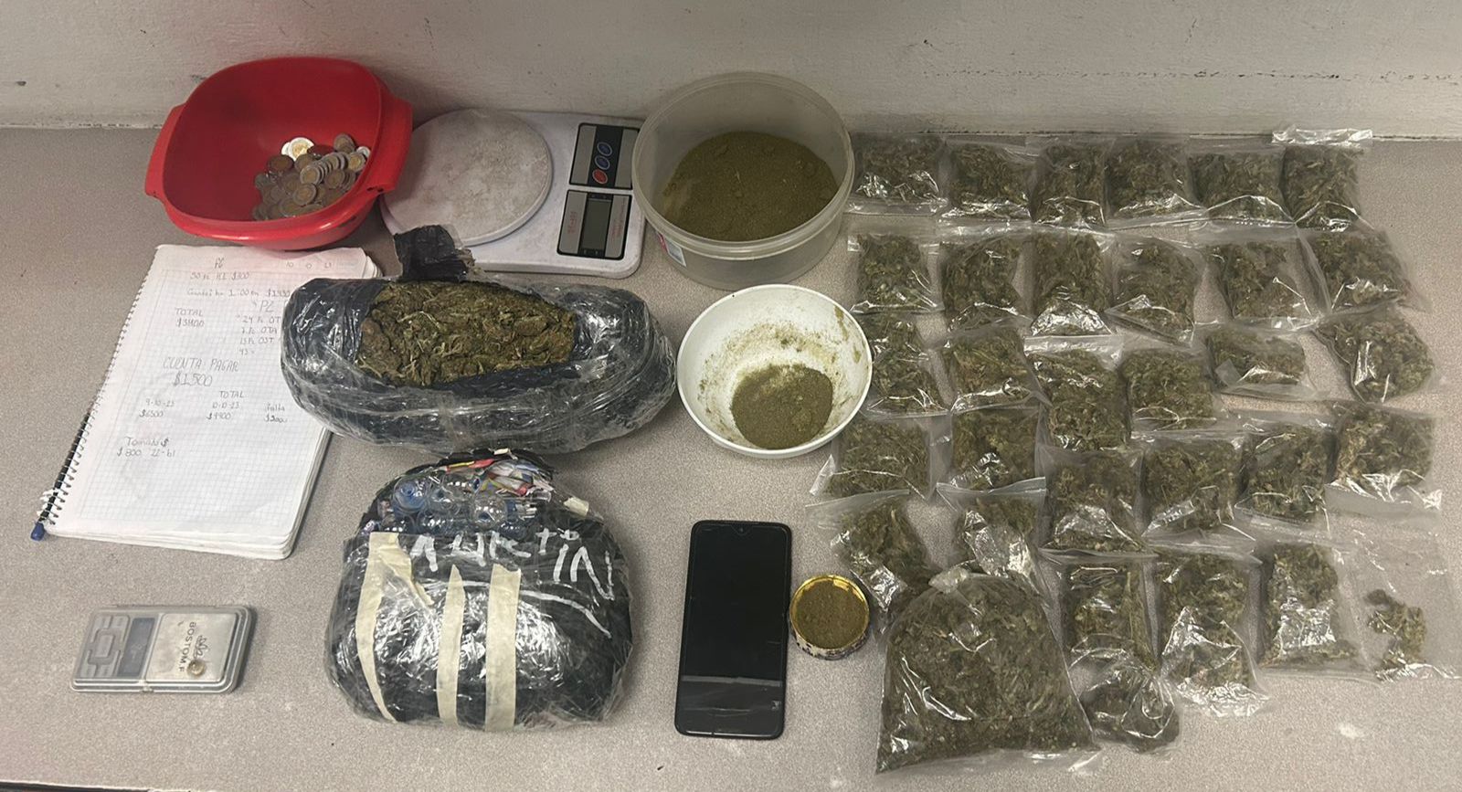 Este mandamiento judicial fue otorgado, por ello agentes de la Fiscalía Edoméx, quienes contaron con el apoyo de elementos del orden federal, estatal y municipal, incursionaron en el inmueble, donde fueron asegurados contenedores, paquetes envueltos con cinta adhesiva y envoltorios con hierba verde con las características de la marihuana, con un peso aproximado de 5 kilogramos, también fueron halladas dos básculas, una libreta con diversas anotaciones y un teléfono celular al parecer relacionado con otro hecho delictivo.