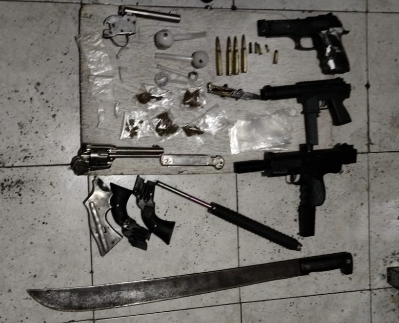 Uno de los inmuebles está ubicado en avenida Cuauhtémoc, de la colonia Santiago, donde fueron halladas bolsas con droga conocida como cristal, envoltorios con hierba verde con las características de la marihuana, tres réplicas de arma de fuego, cartuchos útiles calibre .22 mm y 7.62 mm, dos navajas, un machete, un bastón retráctil y piezas de arma de fuego.