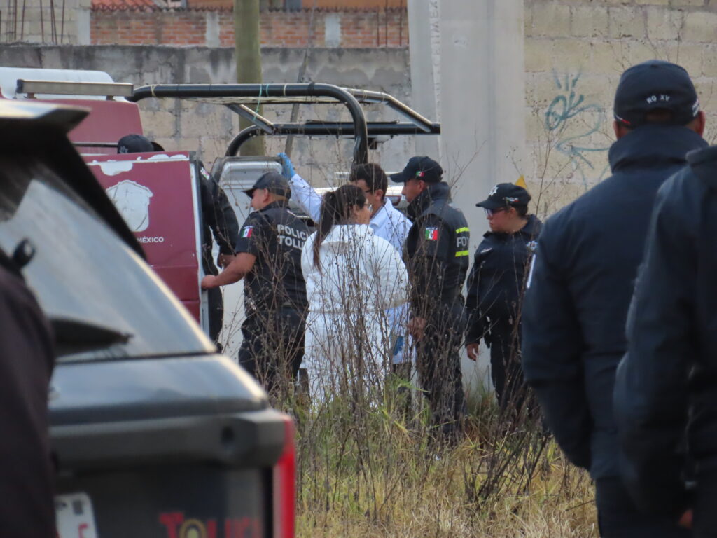«La vinieron a tirar o matar aquí, no es de la colonia», dice una vecina, mientras el equipo forense realiza el levantamiento del cuerpo de una mujer asesinada junto a la barda de un predio baldío en San Miguel Totoltepec en Toluca.