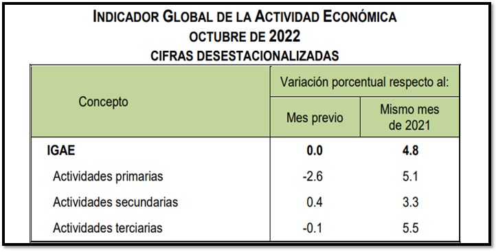 Por otra parte, en octubre y con cifras desestacionalizadas, el IGAE no presentó cambio a tasa mensual.