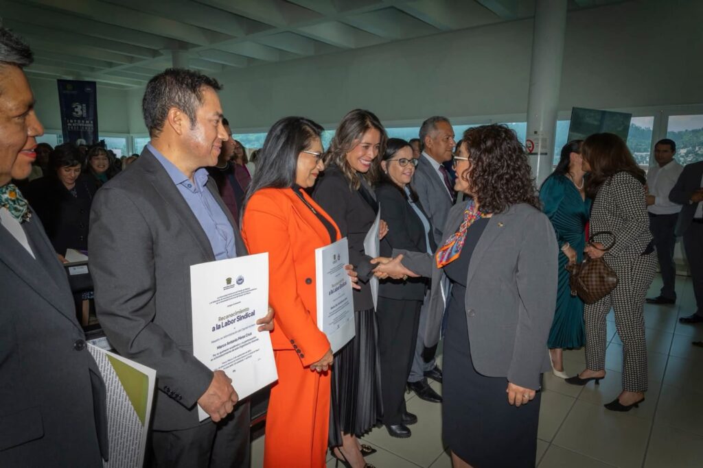 Por su parte, Gilda González Villaseñor presentó ante la secretaria de Gestión y Administración, Miriam Padilla Mora; la directora de Recursos Humanos, Claudia Guzmán Flores, y el acreedor al reconocimiento a la Labor Sindical, Ricardo Martínez Zavala, los avances obtenidos en la negociación del Contrato Colectivo de Trabajo, que incluyó un incremento directo al salario tabular de 4%, la mejora de 14 cláusulas del Contrato Colectivo de Trabajo, así como la regularización de plazas, 87 recategorizaciones docentes y la entrega de 22 mil 550 implementos de trabajo. Durante el periodo informado, dijo, también se realizaron más de 25 mil trámites de atención al personal académico.