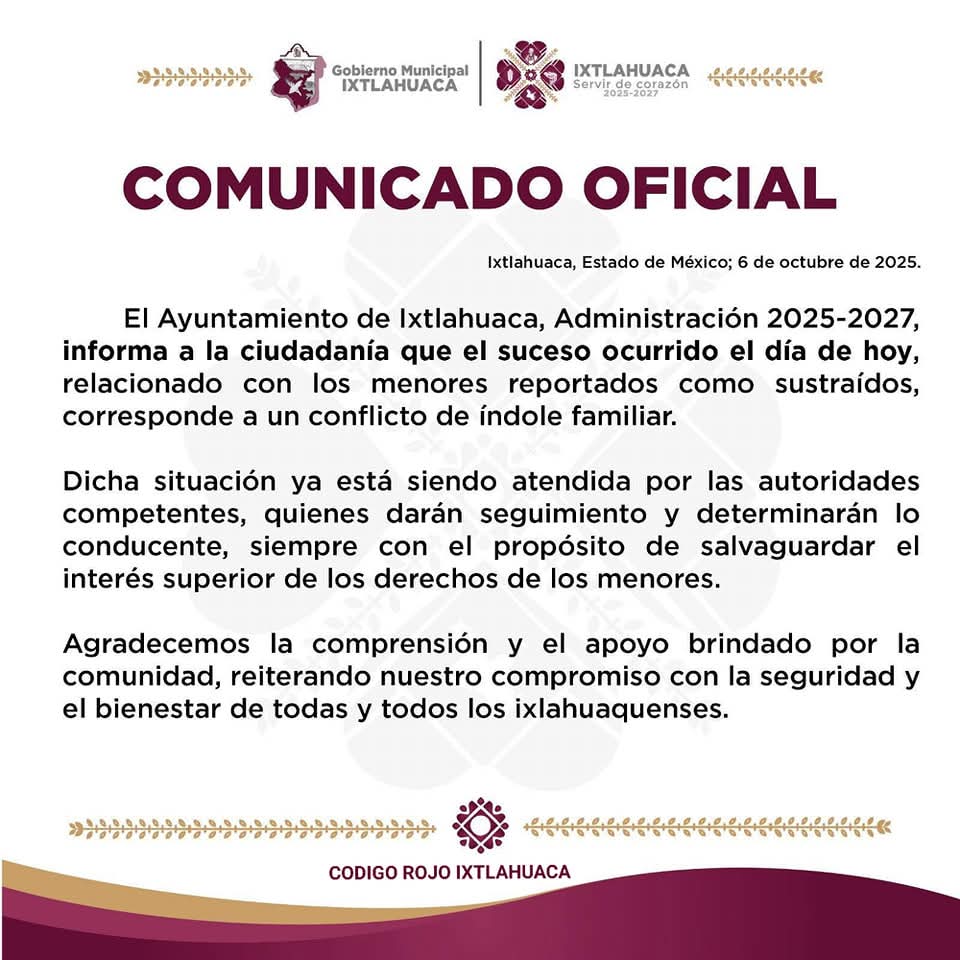 A través de un comunicado, el ayuntamiento de Ixtlahuaca, encabezado por Guadalupe Díaz Avilez, informó que desde el primer momento en que se tuvo conocimiento de los hechos se activaron los protocolos de emergencia establecidos por la autoridad municipal y estatal, con el objetivo de proteger a las víctimas y garantizar una respuesta inmediata.