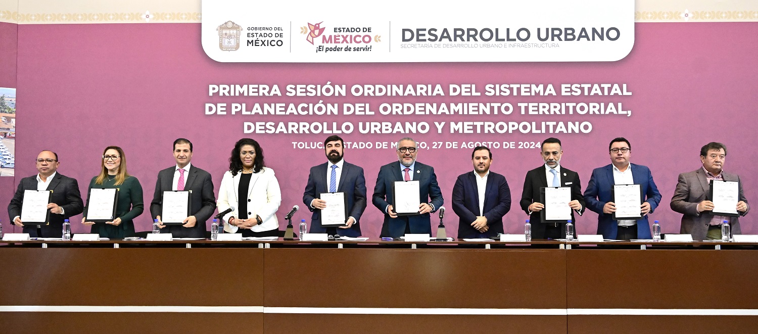 En el marco de la Primera Sesión Ordinaria del Sistema Estatal de Planeación del Ordenamiento Territorial, Desarrollo Urbano y Metropolitano, el Gobierno del Estado de México y los presidentes municipales de la zona de influencia del Tren México-Toluca “El Insurgente” firmaron un convenio para garantizar un crecimiento urbano con sentido social y estratégico que beneficie a las familias de la región.