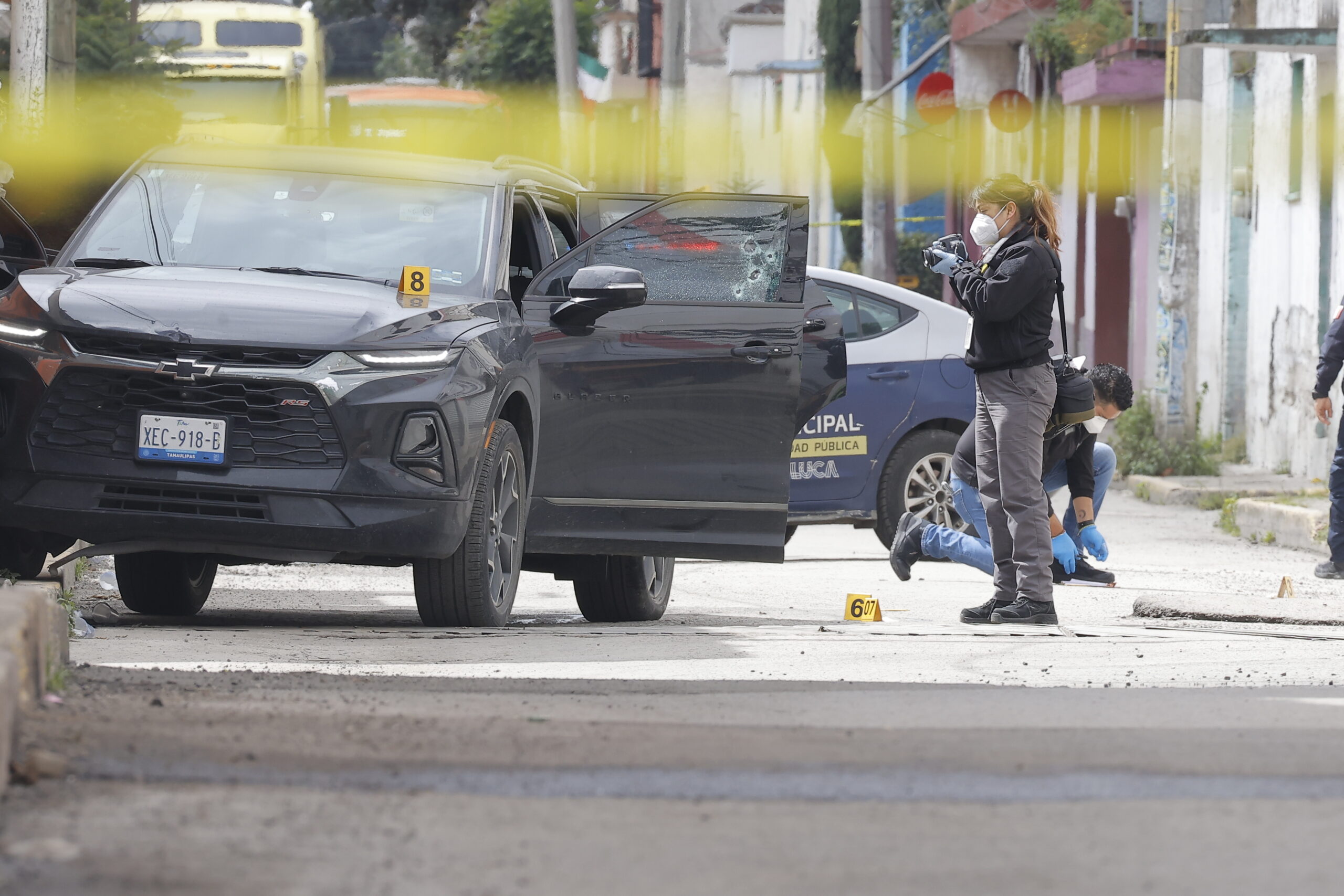 «Sacaron dos mochilas», dice una mujer, mientras se persigna y observa como peritos levantan el cuerpo de un hombre asesinado a balazos a bordo de una camioneta por sicarios en moto que huyeron en Capultitlán en Toluca.