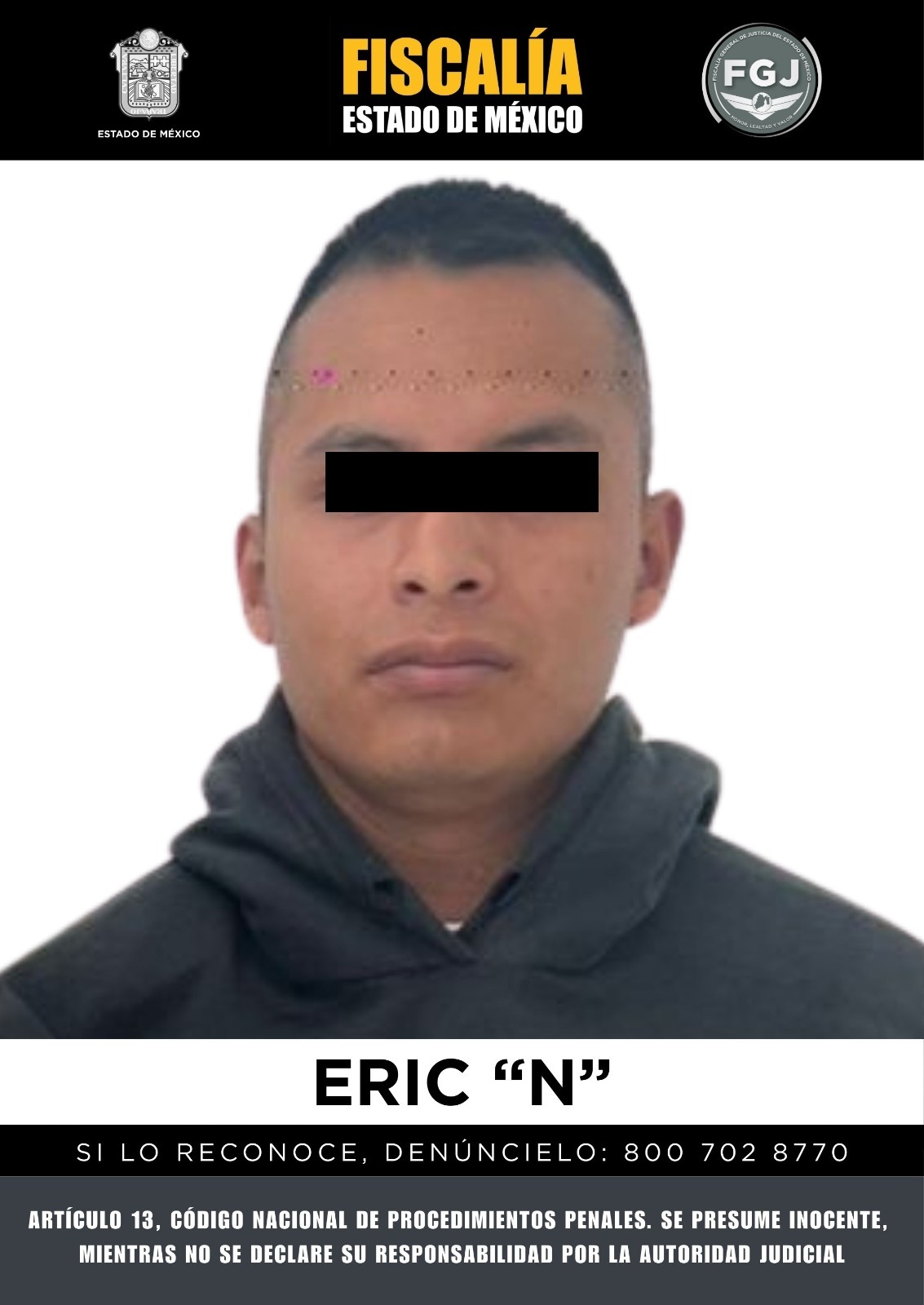 Elementos de la Fiscalía General de Justicia del Estado de México cumplimentaron una orden de aprehensión en contra de un individuo identificado como Eric “N”, quien es investigado por su probable participación en el delito de feminicidio en agravio de una menor de edad.