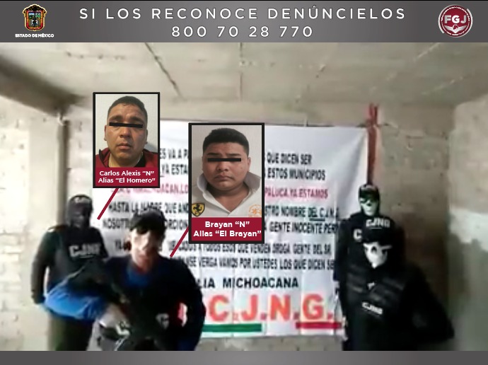 Cabe hacer mención que de las diligencias hechas por esta Institución se ha podido establecer que Bryan “N” y Carlos Alexis “N”, así como dos sujetos más, son quienes aparecen en un video difundido hace varias semanas por redes sociales y algunos medios de comunicación, en el que se observa a cuatro personas quienes portan armas, tienen el rostro cubierto y ropa táctica con las siglas CJNG.