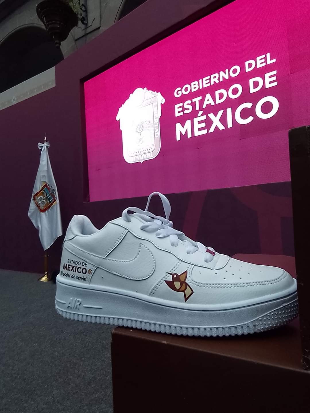 Durante el abanderamiento de la delegación mexiquense, se presentaron estos tenis de edición especial, los cuales, exhiben el colibrí que distingue a la administración estatal encabezada por Delfina Gómez Álvarez.
