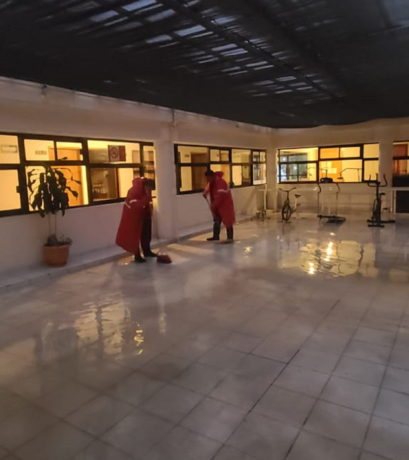En la casa hogar “El Pueblito de los Abuelos”, ubicada en la colonia FOVISSSTE, una cuadrilla del Grupo Tláloc realizó labores de achique para suprimir los cinco centímetros de agua que la ensuciaron y posteriormente lavaron pisos y patios.