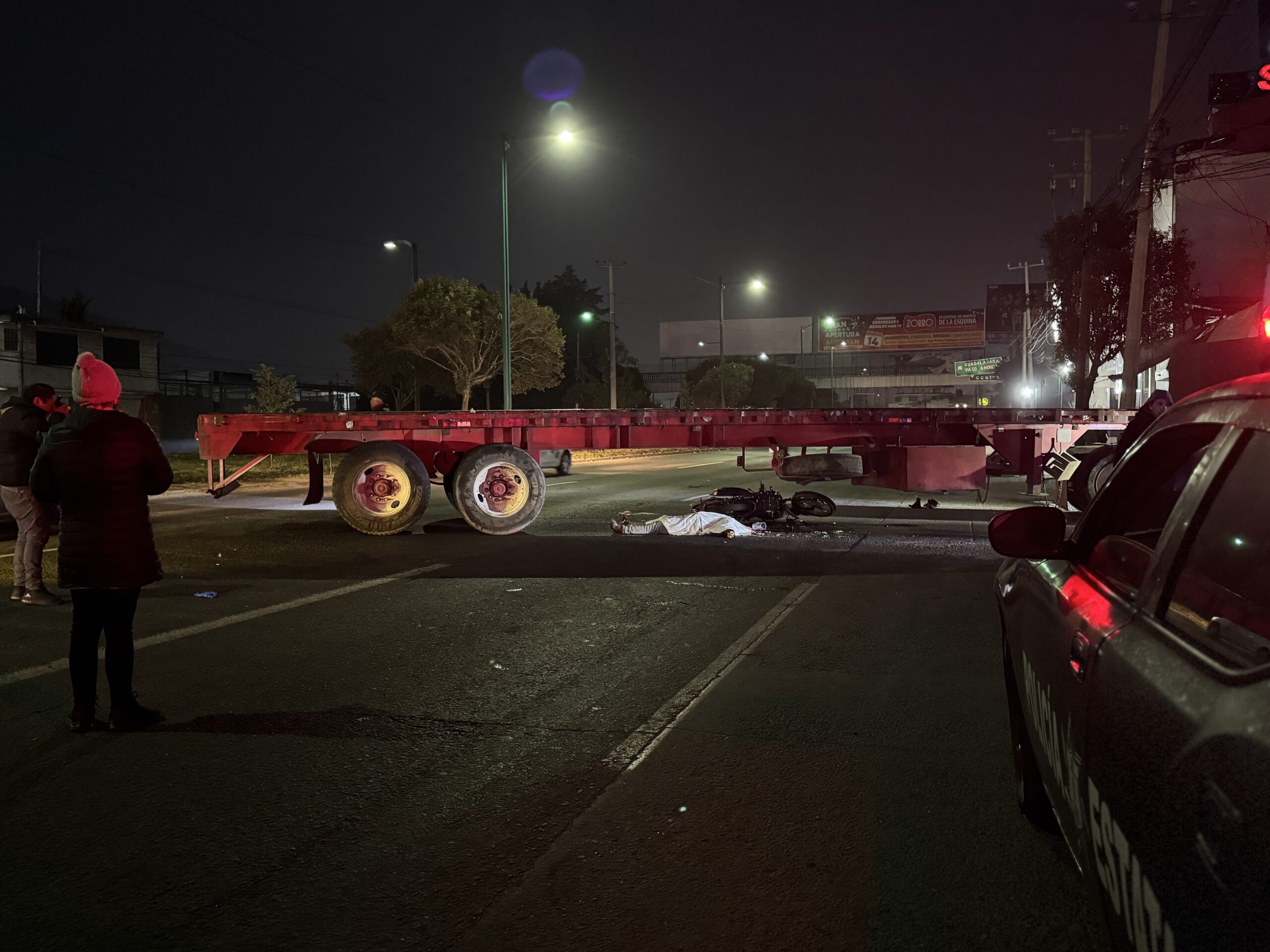 Luego de impactar su motocicleta en la plataforma de un tráiler que intentaba dar vuelta, Andre Etzel quedó sin vida junto a su unidad, no llevaba casco ni equipo de seguridad en la colonia La Magdalena en Toluca.