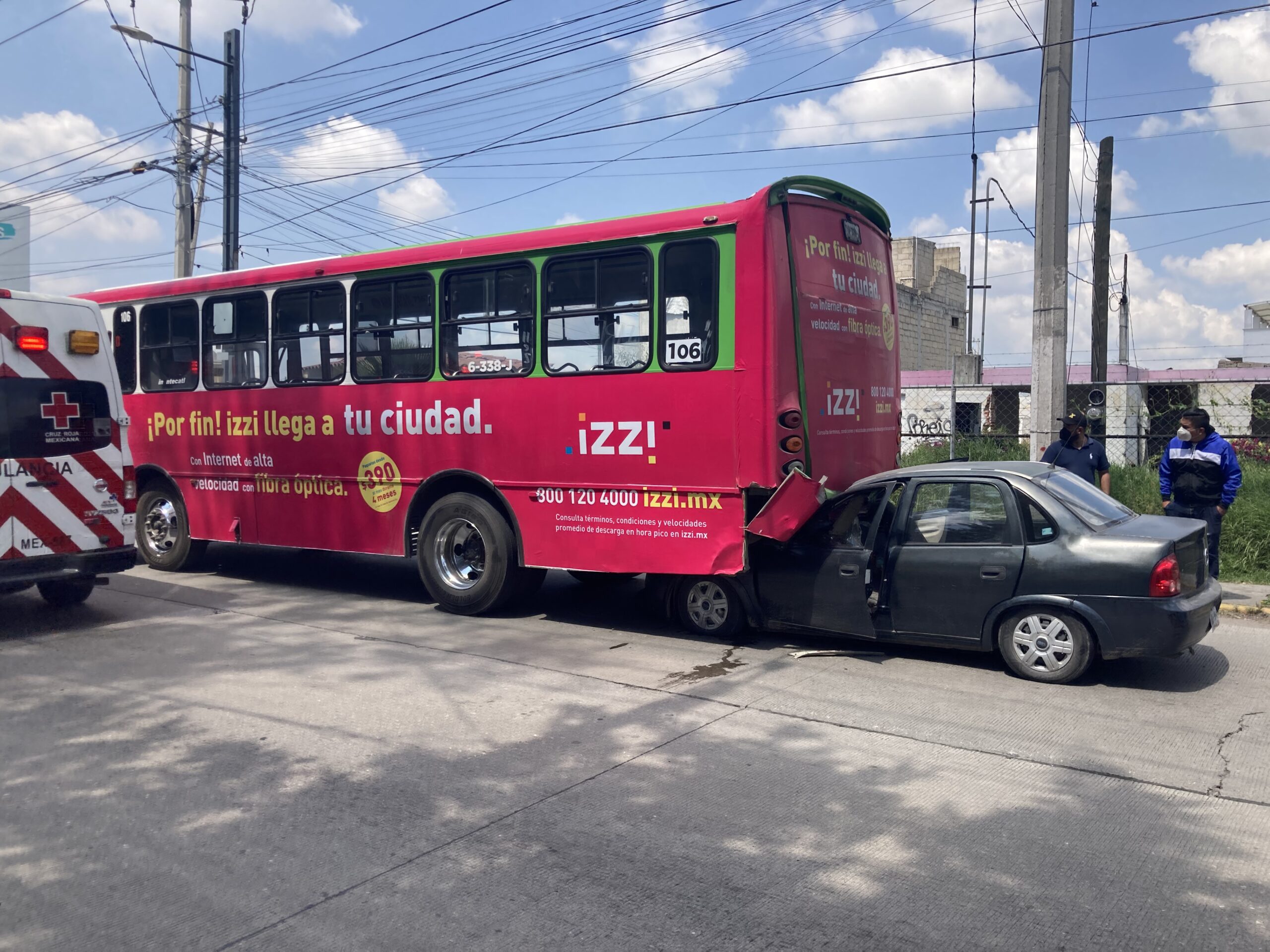 El automóvil particular acabó incrustado atrás del transporte público de la empresa Xinantécalt con número económico 106, en el cruce con la calle Artículo 27, eran cerca del mediodía del sábado, indicaron autoridades.