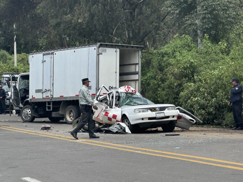 «Le ganó la curva, dio varias vueltas y chocó la cajuela de frente con el camión», dice un oficial, mientras peritos liberan los cuerpos de cuatro hombres fallecidos a bordo de un taxi que se impactó con un vehículo de carga.