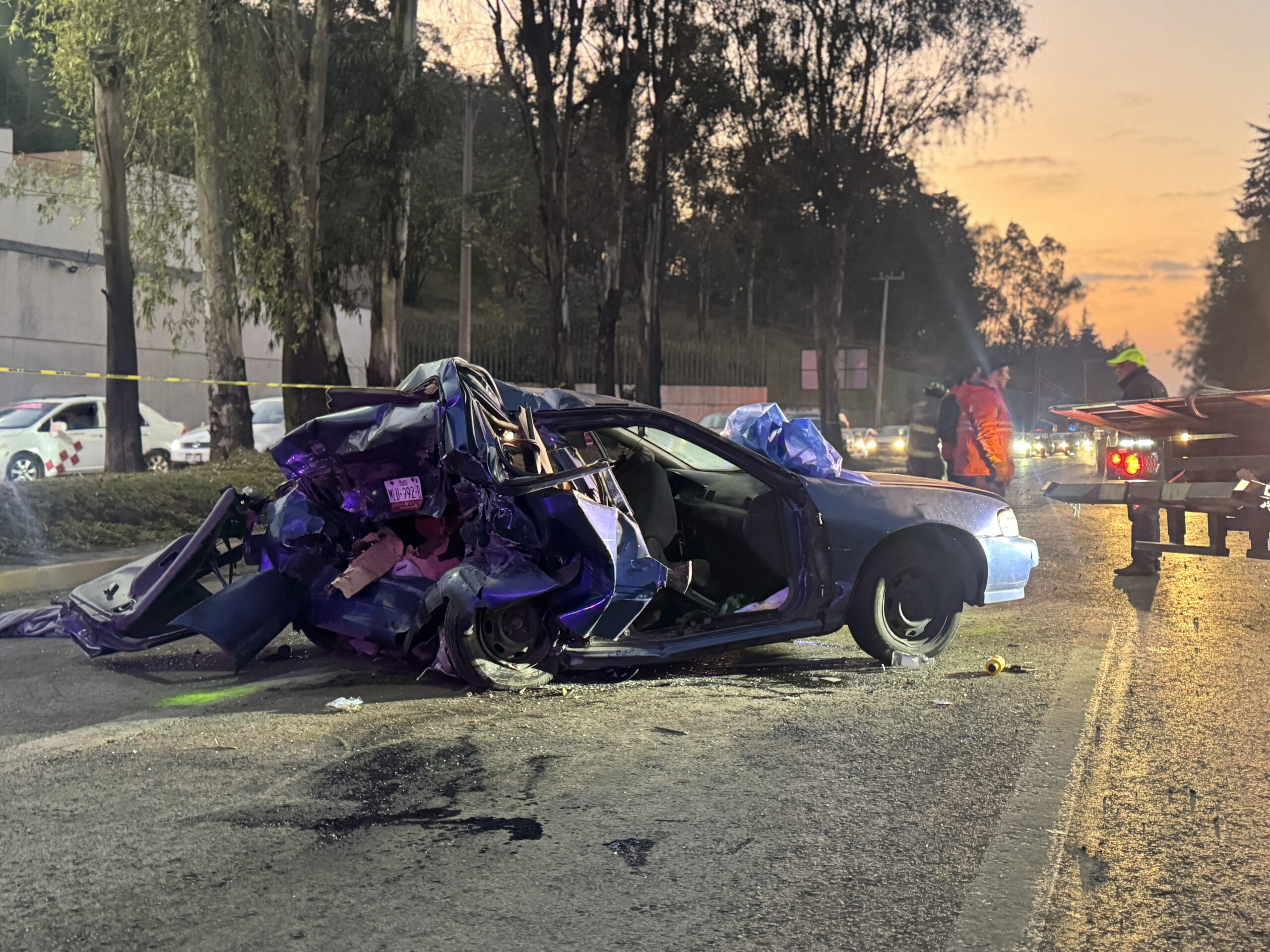 Las víctimas de unos 40 años, quedaron en los asientos traseros de una unidad Nissan color azul que terminó destrozado luego de la colisión sobre la carretera Toluca Tenango del Valle, era la madrugada del domingo.