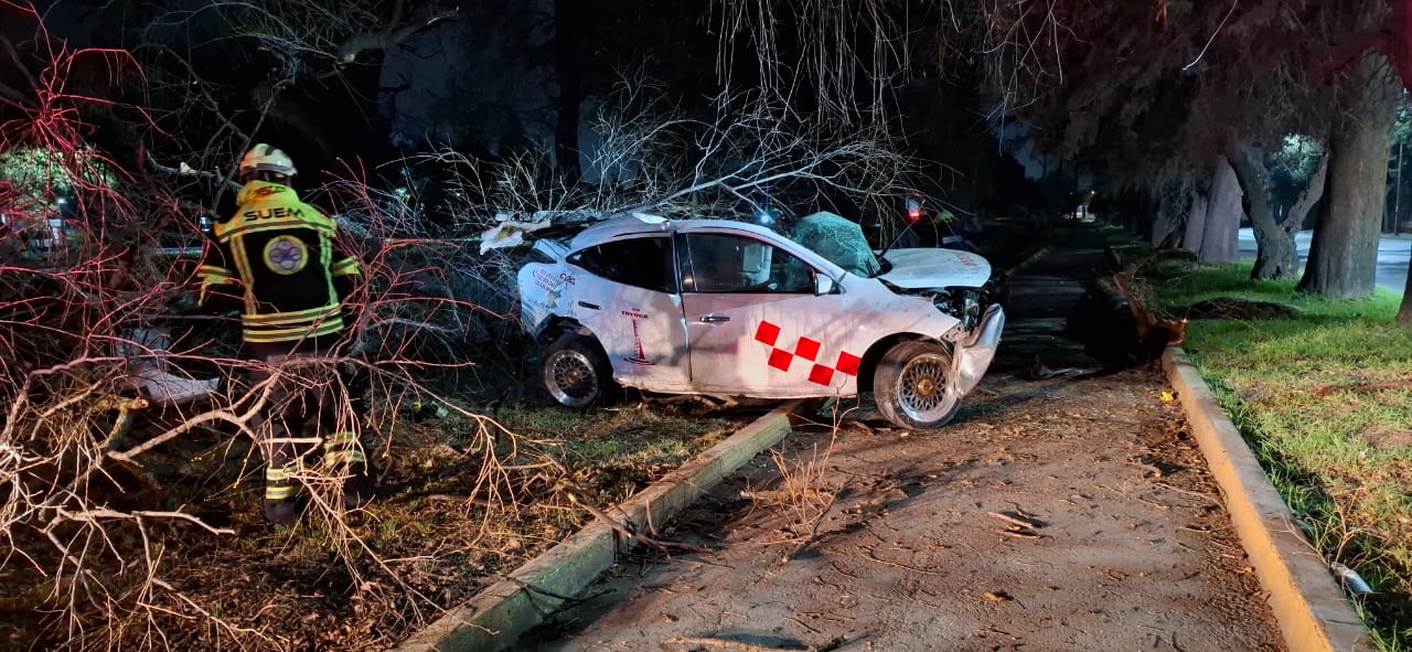 El automóvil con cromática del servicio público y placas de circulación A569JTJ terminó completamente destruido luego de la colisión en los carriles laterales de Paseo Tollocan con Santa María, la madrugada del martes.