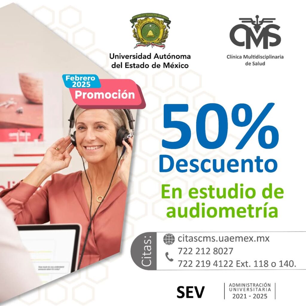 n el marco de la Semana de la Salud Auditiva, la Clínica Multidisciplinaria de la Salud (CMS) de la Universidad Autónoma del Estado de México (UAEMéx), ofrecerá el estudio de audiometría al 50 por ciento de descuento hasta el 28 de febrero.