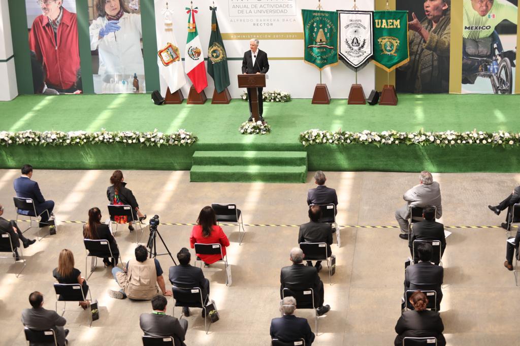 Ante los desafíos del sector educativo por la pandemia, el Gobernador Alfredo Del Mazo Maza aseguró que la Universidad Autónoma del Estado de México (UAEM) afronta con determinación un momento importante en su historia, y acentuó la gestión del Rector Alfredo Barrera Baca, porque en cuatro años de trabajo preparó a la máxima casa de estudios mexiquense para adaptarse, superar los desafíos del confinamiento y fortalecerse para lograr una comunidad universitaria más unida.