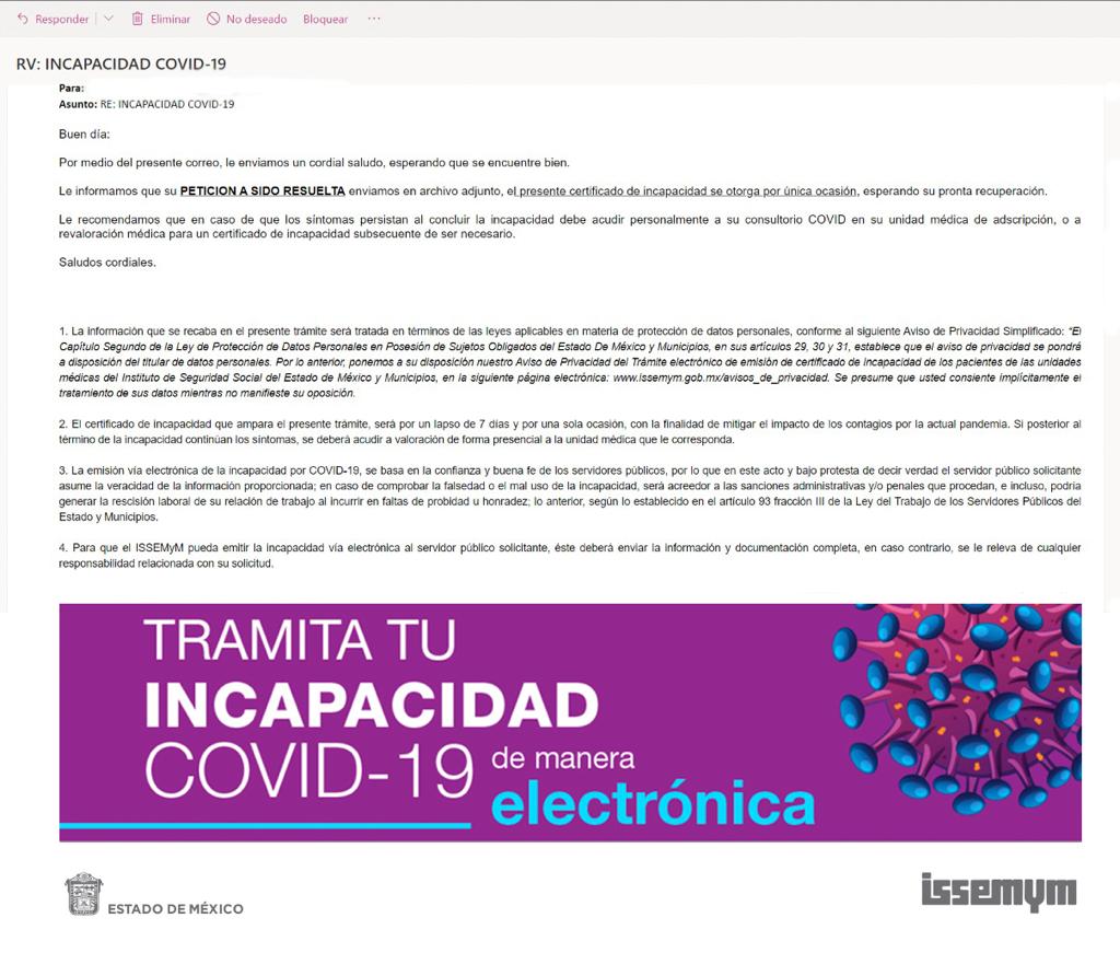 La institución de Seguridad Social informa que este programa sigue vigente y pone a disposición de los derechohabientes la lista con los requisitos y correos habilitados para tramitar la incapacidad por COVID-19, en la página https://www.issemym.gob.mx/incapacidad_covid.