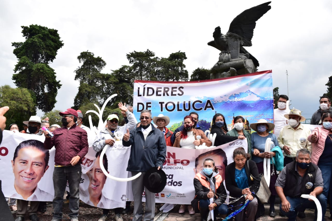 Los Líderes de Toluca encabezados por Javier Salas hicieron un acto de solidaridad con la campaña de Juan Rodolfo en el ya tradicional monumento del Águila ubicado en la calle de Cristóbal Colón, donde se celebran los triunfos deportivos e incluso se han festejado los anteriores resultados electorales.
