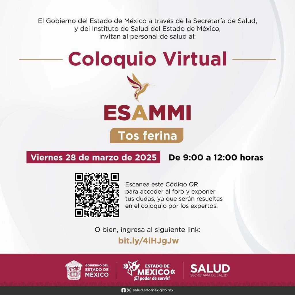 Para impulsar la capacitación del sector salud, el Gobierno del Estado de México convoca a médicas y médicos, enfermeras y enfermeros del primer nivel de atención y personal en formación, al Coloquio Virtual Estrategia en Salud para Abatir la Morbi- Mortalidad Infantil (ESAMMI) Tosferina, que se realizará el viernes 28 de marzo próximo.
