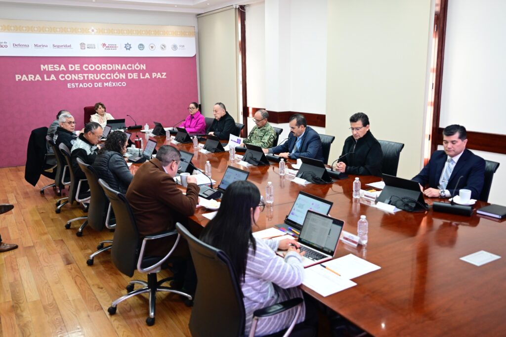 En la sesión 339 de la Mesa de Coordinación para la Construcción de la Paz, participaron Horacio Duarte Olivares, Secretario General de Gobierno del Estado de México; Cristóbal Castañeda Camarillo, Secretario de Seguridad; José Luis Cervantes Martínez, Fiscal General de Justicia del Estado de México.