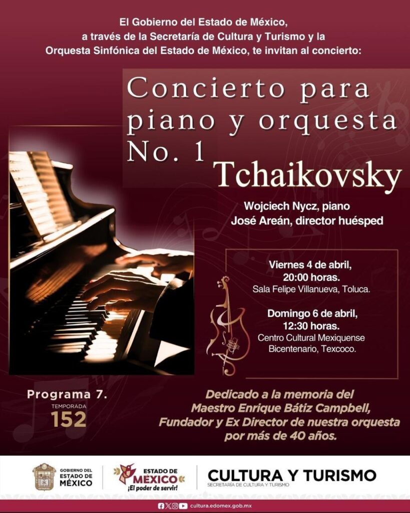 El Concierto para piano y orquesta No.1 Tchaikovsky, la OSEM tendrá la participación de José Areán, director que ha estado a cargo de importantes orquestas en México, América y Europa, consolidándose como un referente en la interpretación de un repertorio diverso y de gran exigencia técnica.