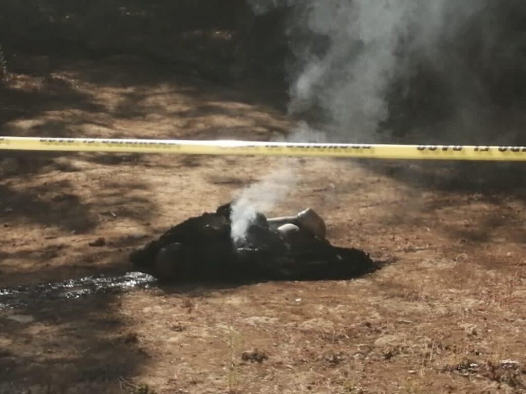 El hallazgo se registró el lunes sobre la calle Paseo La Palma y camino al Panteón, al momento que vecinos observaron los restos humanos del que aún salía humo, en el sitio se localizó una garrafa de 4 litros con gasolina.