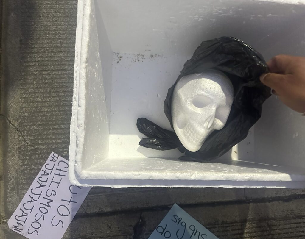 Vaya susto se llevaron vecinos y policías, ya que alguien les realizó una broma de mal gusto, dentro de una hielera abandonaron una cabeza de unicel junto con dos mensajes en el barrio San Bernardino en Toluca.