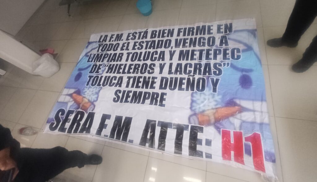 «Toluca tiene dueño y siempre será F.M», dice una lona que apareció colgada en un puente peatonal de la colonia El Seminario Primera Sección en Toluca, atribuida a un grupo delictivo con orígenes en el estado de Michoacán.