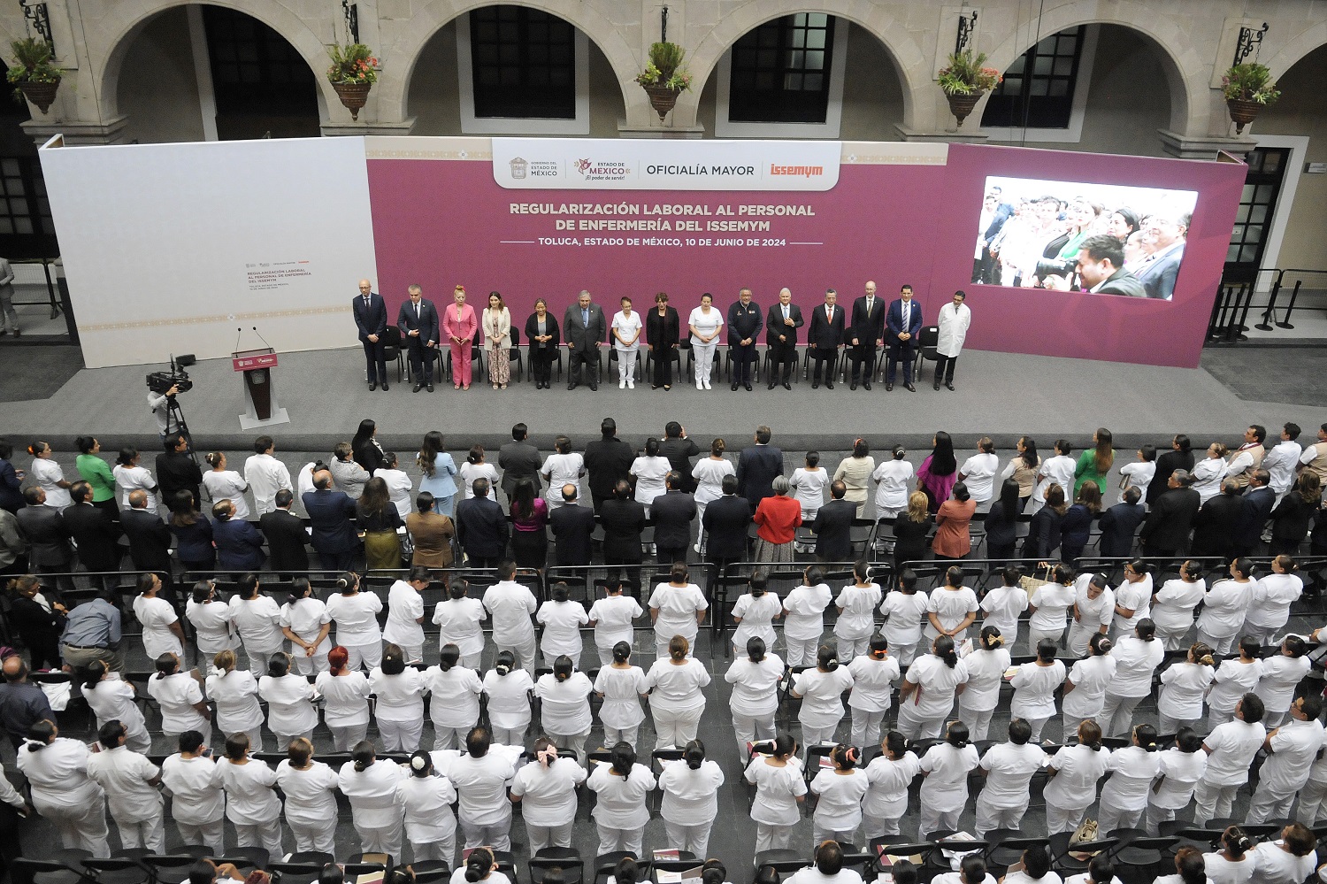 “Hoy saldamos una deuda más, iniciamos la regularización laboral de las enfermeras y enfermeros de nuestra institución, que es el ISSEMyM, gracias a un detallado trabajado en equipo se logra la liberación de 100 plazas para la basificación del personal de enfermería contratado bajo la modalidad de eventual, vamos a beneficiar a sus familias, con el ánimo genuino, pero, sobre todo, con el derecho de vivir con tranquilidad y estabilidad en su trabajo”, refirió la Gobernadora Delfina Gómez Álvarez.