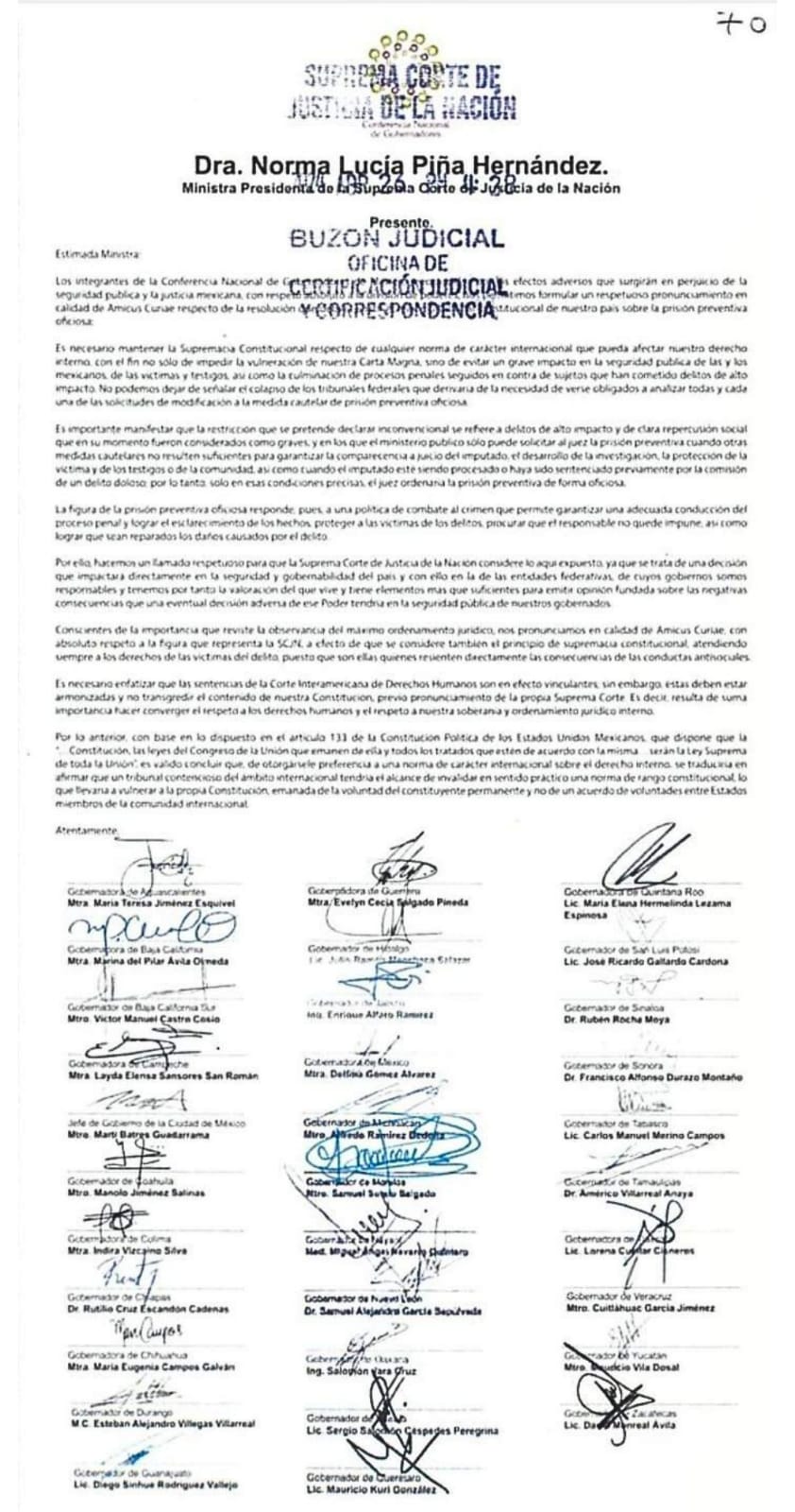 El documento, firmado por las y los 31 gobernadores y el jefe de gobierno de la Ciudad de México, fue entregado al buzón judicial para que sea analizado por la SCJN en calidad de «amicus curiae», una figura de colaboración para la Corte en la resolución de algún tema de relevancia.