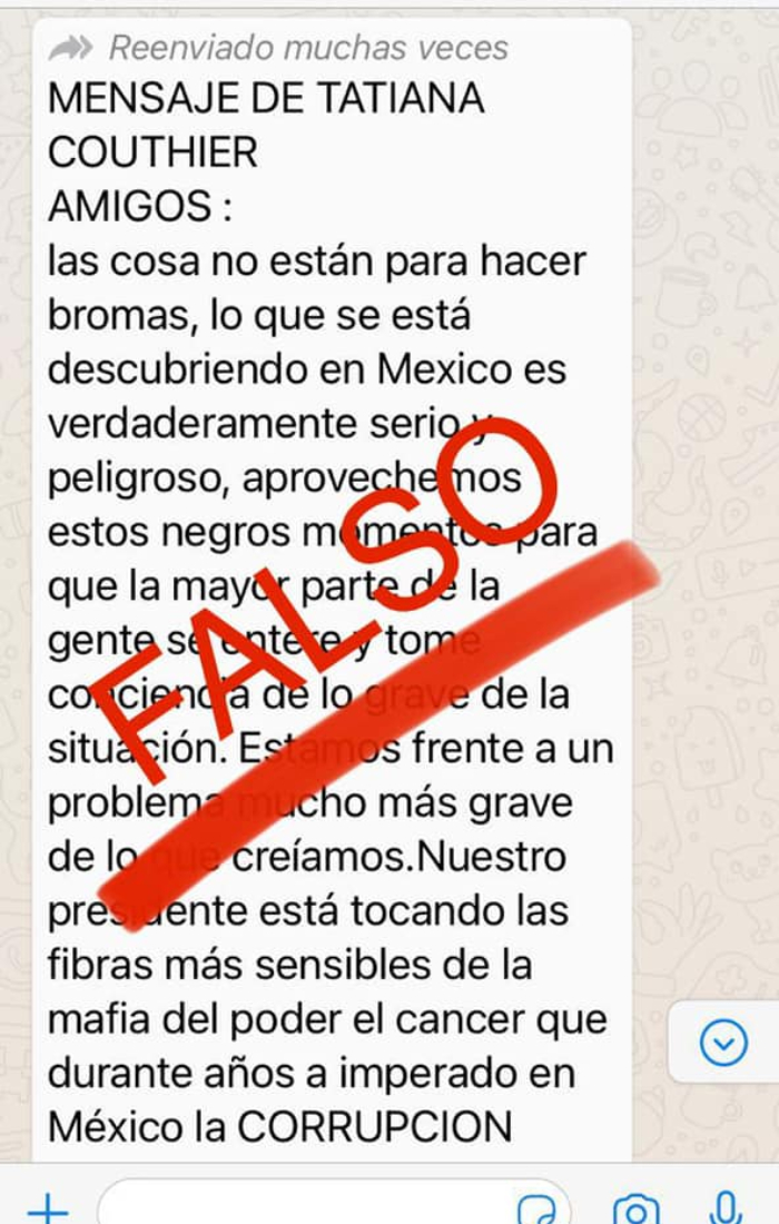 El mensaje comienza diciendo: “Amigos: las cosas no están para hacer bromas, lo que se está descubriendo en México es verdaderamente serio y peligroso, aprovechemos estos negros momentos para que la mayor parte de la gente se entere y tome conciencia de lo grave de la situación. Estamos frente a un problema mucho más grave de lo que creíamos. Nuestro Presidente está tocando las fibras más sensibles de la mafia del poder el cáncer que durante años ha imperado en México, la corrupción”.