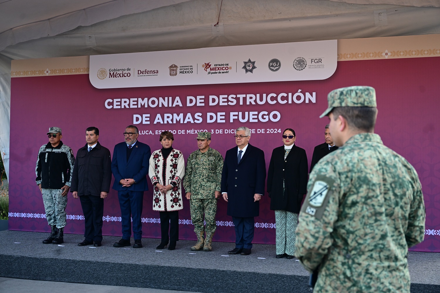 La Gobernadora del Estado de México, Delfina Gómez Álvarez encabezó la Ceremonia de Destrucción de Armas de Fuego, decomisadas a la delincuencia en operativos realizados en la entidad; como resultado de la estrategia de seguridad y del trabajo conjunto al interior de la Mesa de Coordinación para la Construcción de la Paz, donde participan autoridades de seguridad y procuración de justicia estatal y federal.