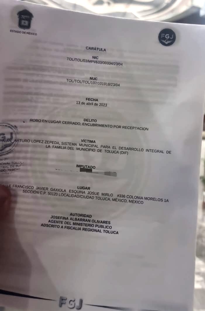 El documento ingresado con fecha 13 de abril de 2023 señala que -tras una revisión- se identificaron como faltantes elementos de papelería, recibos, notas, facturas, material de señalamiento interno con las leyendas “LACTANTES, PREPARATORIO, MATERNALES” , entre otras, con el logotipo del Ayuntamiento de Toluca y la leyenda del DIF Toluca en color blanco con verde y rosa; así como documentación oficial de las carpetas referentes a las Estancias Infantiles correspondientes al año 2022.