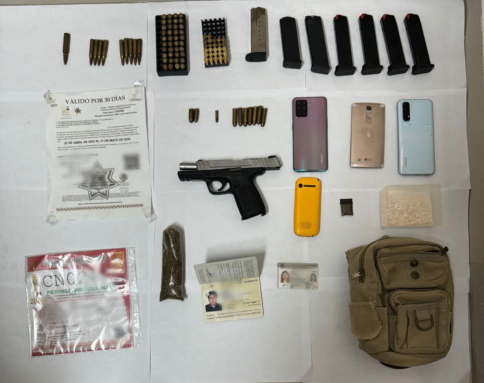Como resultado de lo anterior, fueron detenidas Key Guadalupe “N” y Selma Selenia “N”, quienes viajaban a bordo del vehículo marca Peugeot, a estas femeninas les fueron asegurados posibles narcóticos. Al continuar con las pesquisas fue desplegada otra acción operativa, está en la colonia Atlacomulco también en Nezahualcóyotl, donde fueron detenidos Sergio César “N” y Javier “N”, sujetos a los que les fue asegurado un vehículo marca Nissan, tipo Tsuru y una motocicleta marca Italika, así como dos permisos provisionales de circulación del Estado de Guerrero de los que se investiga su legitimidad, además de dosis de narcóticos, un arma de fuego corta, seis cargadores de arma de fuego y 87 cartuchos de diversos calibres.