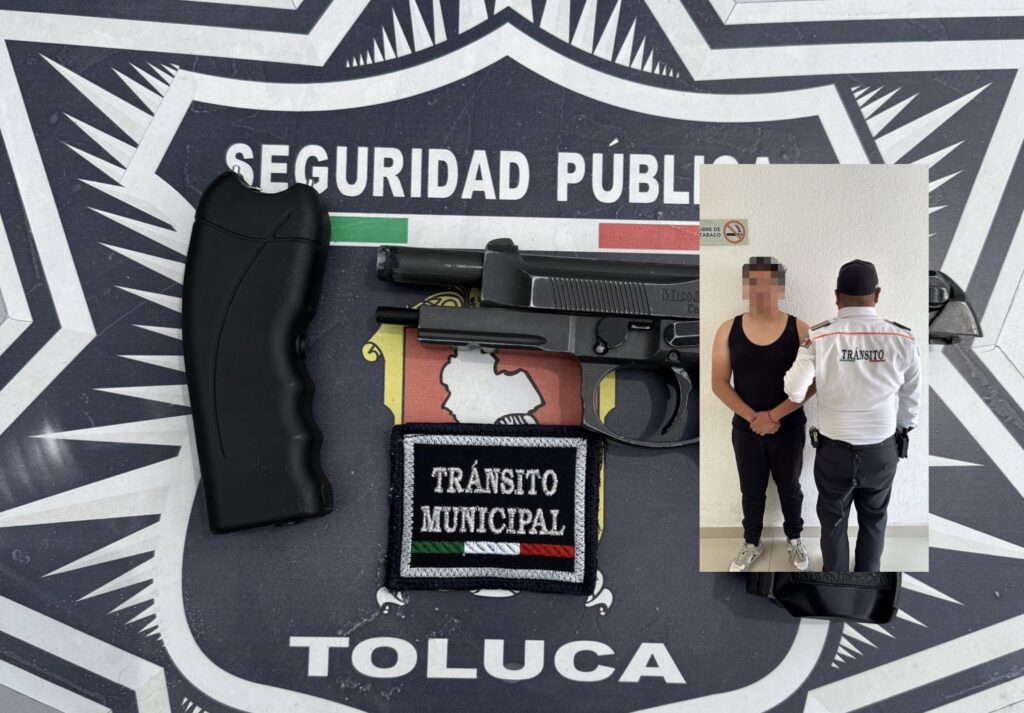 Durante un operativo preventivo implementado por la Dirección General de Seguridad y Protección de Toluca, elementos de Sustentabilidad Vial detuvieron a un joven de 17 años por portar un arma prohibida y simular la presencia de un vehículo oficial.