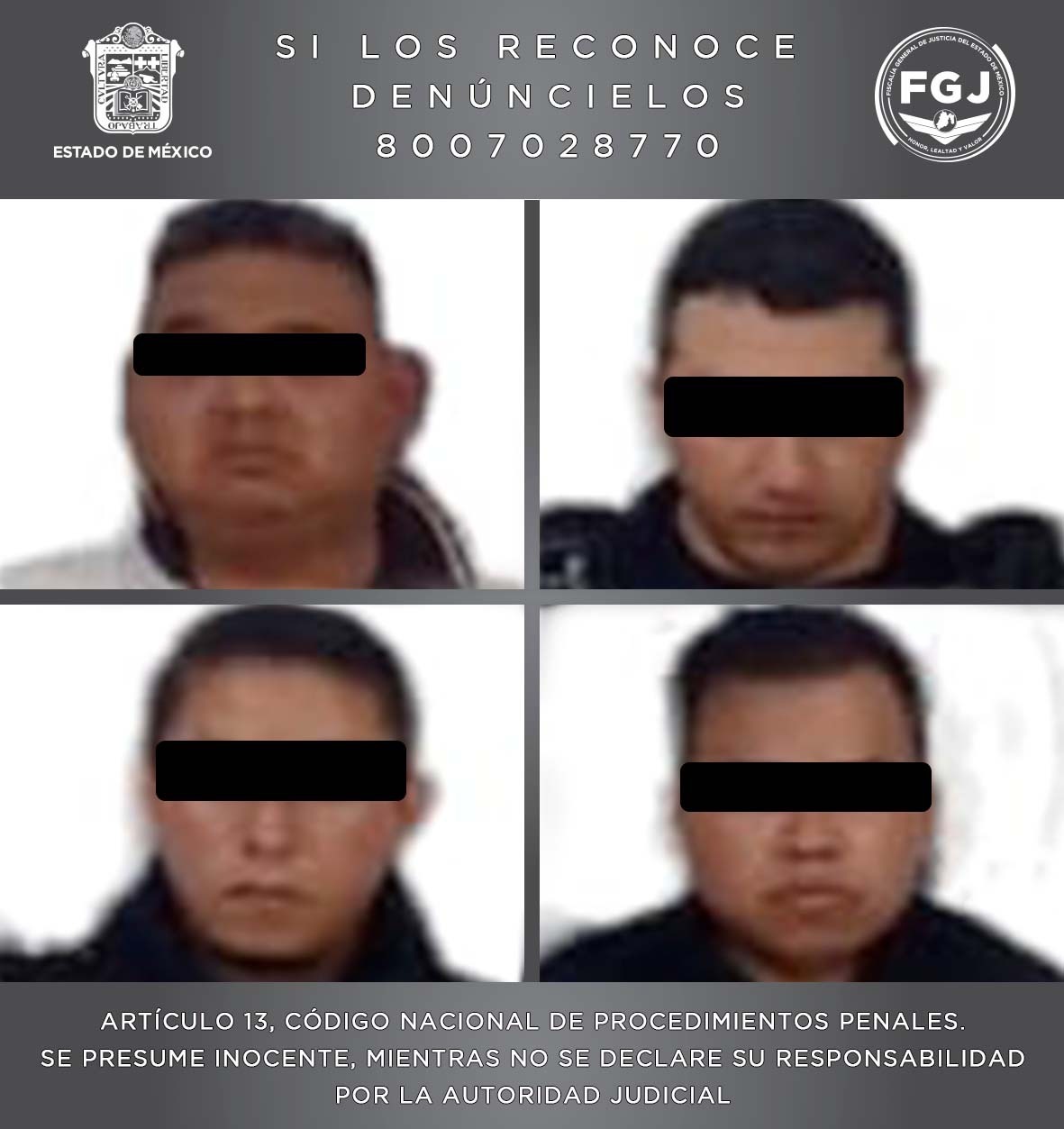 Como parte de una acción conjunta llevada a cabo por la Fiscalía General de Justicia estatal (FGJEM), Secretaría de la Defensa Nacional (SEDENA), Secretaría de Seguridad y Protección Ciudadana federal (SSPC), a través de la Coordinación Nacional Antisecuestro (CONASE), además de la Secretaría de Seguridad estatal (SSEM), fue posible la detención de cuatro elementos de la Policía Municipal de Amanalco, investigados por su probable intervención en hechos delictivos.