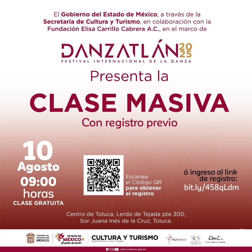 La cita es este domingo 10 de agosto a las 09:00 horas, como parte del gran cierre del Festival Danzatlán 2025. La reconocida bailarina mexiquense Elisa Carrillo, figura internacional de la danza clásica, será la encargada de dirigir esta clase abierta a todo público.
