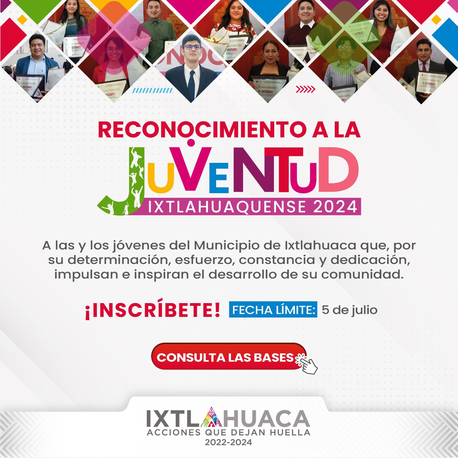 El Gobierno de Ixtlahuaca emitió la convocatoria para el Reconocimiento a la Juventud Ixtlahuaquense 2024, con el objetivo de destacar y celebrar a los jóvenes del municipio que, con su esfuerzo y dedicación, contribuyen al desarrollo y bienestar de su comunidad.