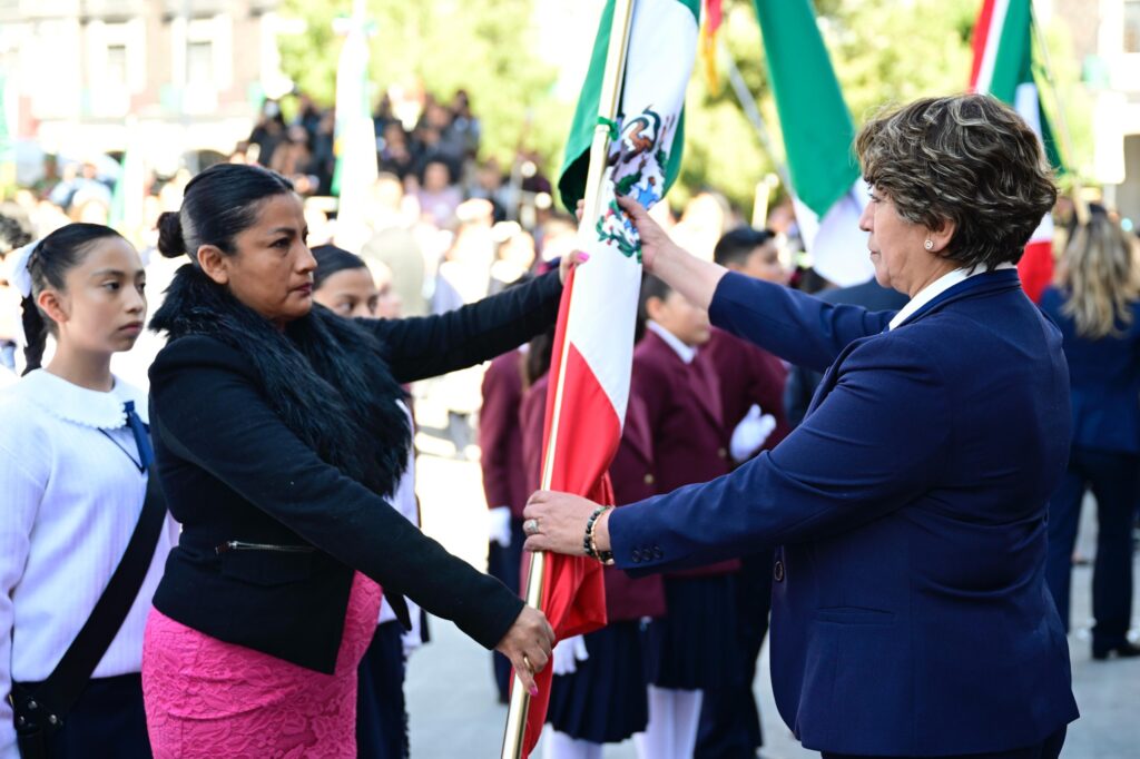 La Gobernadora Delfina Gómez Álvarez encabezó la Ceremonia por el Día de la Bandera y la Toma de Protesta de Bandera a 25 escoltas, en la Plaza de los Mártires en la capital mexiquense, desde ahí se enlazó al acto cívico que encabezó la Presidenta Claudia Sheinbaum Pardo quien tomó protesta de bandera a 920 escoltas de primarias y secundarias de las entidades federativas y a 56 de las fuerzas armadas.