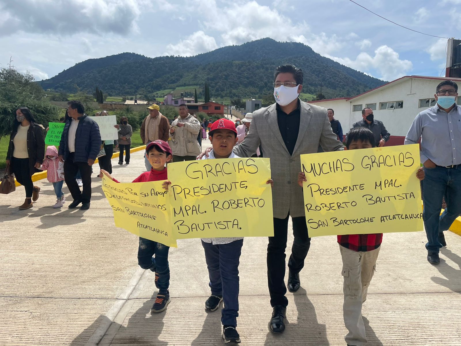 Roberto Bautista, presidente municipal de Tenango del Valle, entregó la pavimentación de la calle Comonfort, que ocupa el tramo entre la calle Adolfo López Mateos y la carretera federal hacia Tenancingo, en la delegación de San Bartolomé Atlatlahuca.