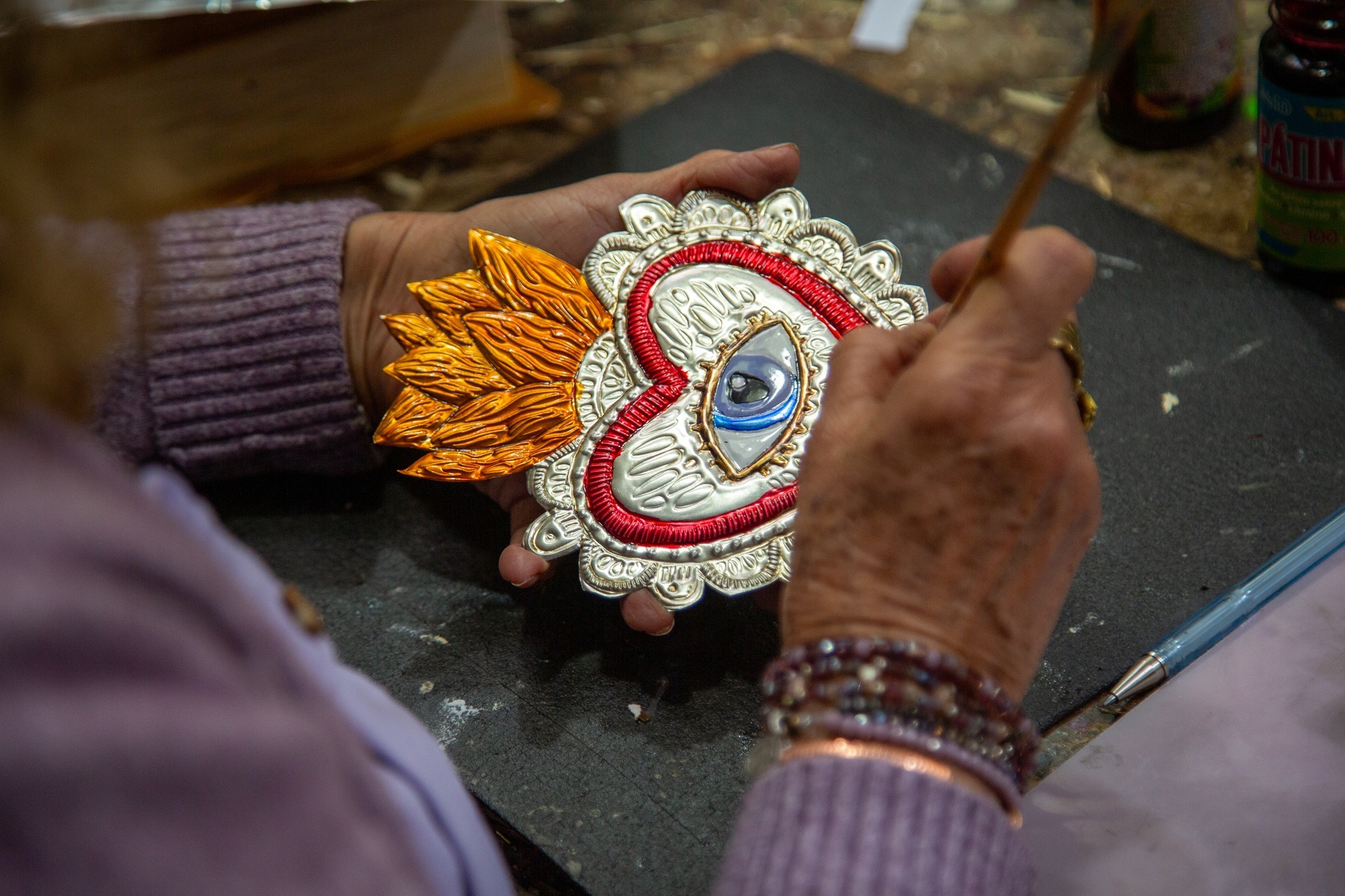 Esta técnica, que forma parte del patrimonio cultural mexiquense, requiere precisión, paciencia y creatividad para transformar láminas de aluminio en piezas decorativas y utilitarias con relieve, color y acabados que protegen cada diseño.
