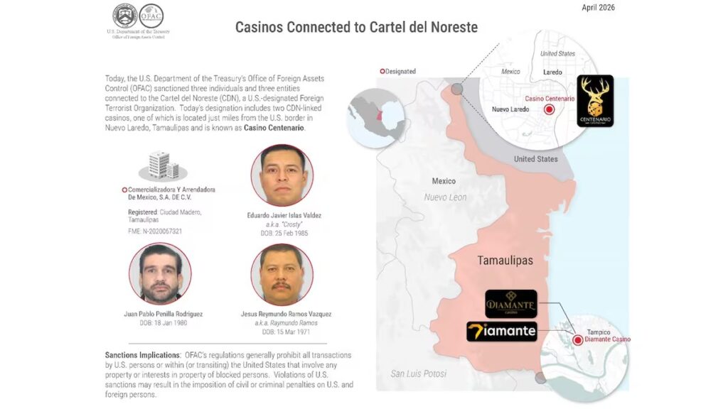 El gobierno de Estados Unidos, a través del Departamento del Tesoro, impuso sanciones a un activista, un abogado, un presunto operador criminal y dos casinos en México, por su supuesta colaboración con el Cártel del Noreste.