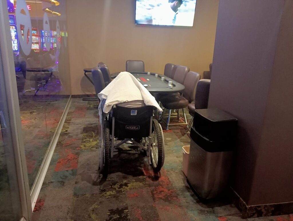 En la silla de ruedas en la que llegó, Óscar Manuel, quedó sin vida junto a una mesa de juego al interior de un casino ubicado en la colonia La Purísima en Metepec; sin embargo, no llegaron familiares hasta el lugar.