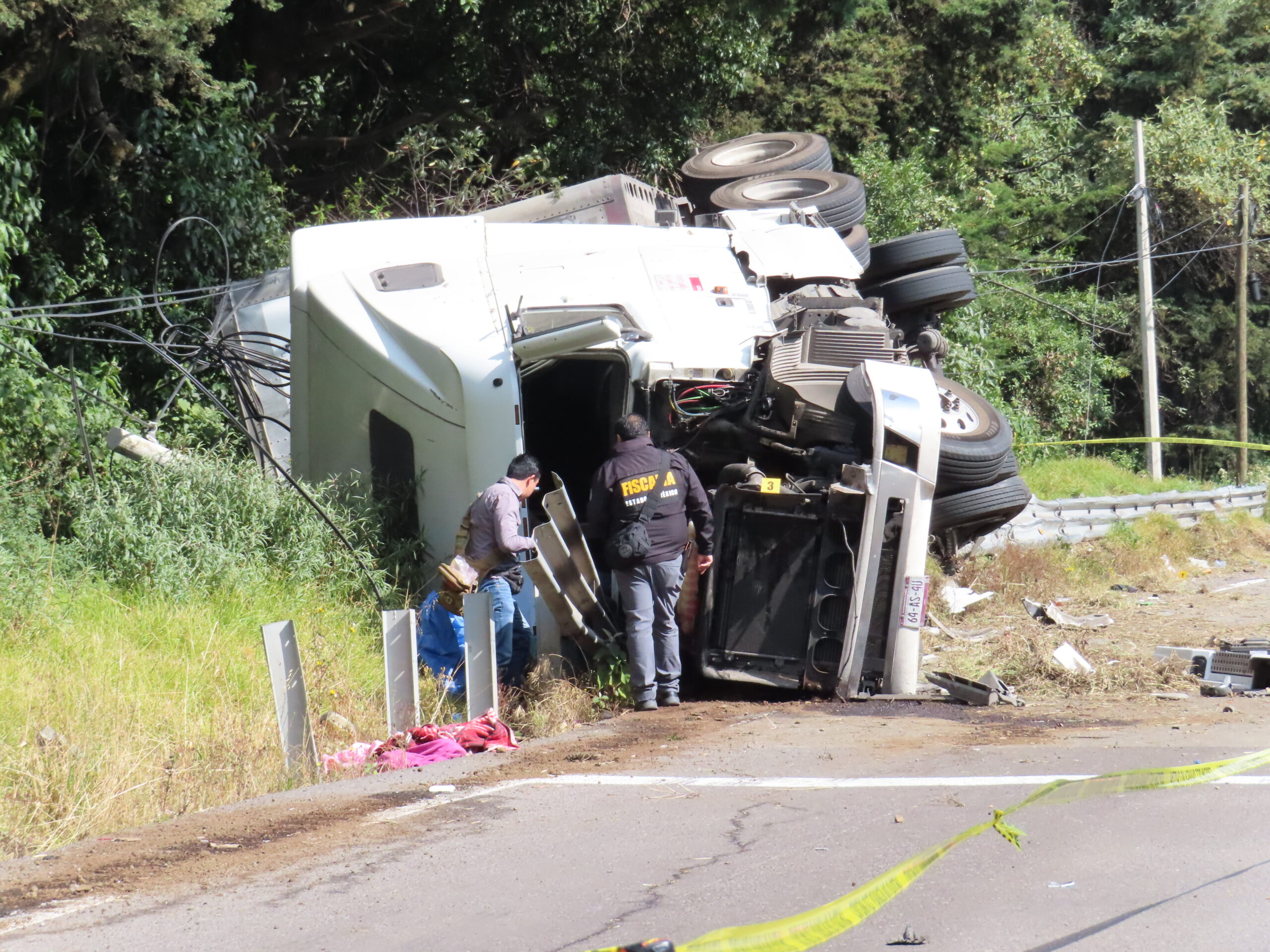 Al interior de la cabina del tractocamión en el que viajaba pero terminó volcado, un hombre que no pudo ser identificado, murió, el conductor salió lesionado y tuvo que ser hospitalizado en la zona de la Escondida en Ocoyoacac.