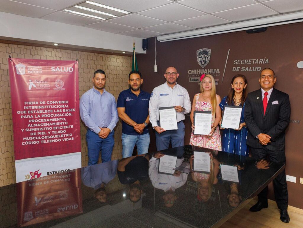 Con el propósito de establecer una coordinación técnica y operativa en la procuración, procesamiento, almacenamiento y suministro de tejidos humanos, las Secretarías de Salud del Estado de México y de Chihuahua firmaron un convenio de colaboración que permitirá mejorar la atención médica a pacientes que requieren injertos de piel, tejido musculoesquelético o membrana amniótica.