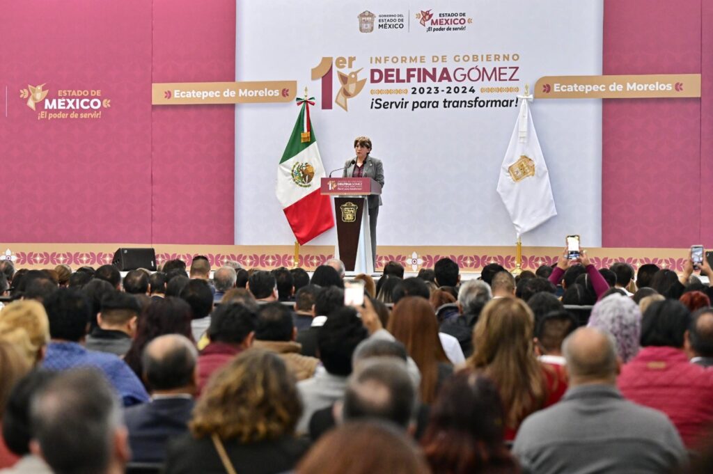 La Gobernadora Delfina Gómez Álvarez rindió su segundo informe regional en Ecatepec, donde destacó avances y el despliegue para atender temas prioritarios en el el Valle de México, como agua, seguridad, movilidad, salud, educación y los programas de bienestar, particularmente aquellos enfocados a apoyar a las mujeres, que son el centro de la política social de este gobierno.